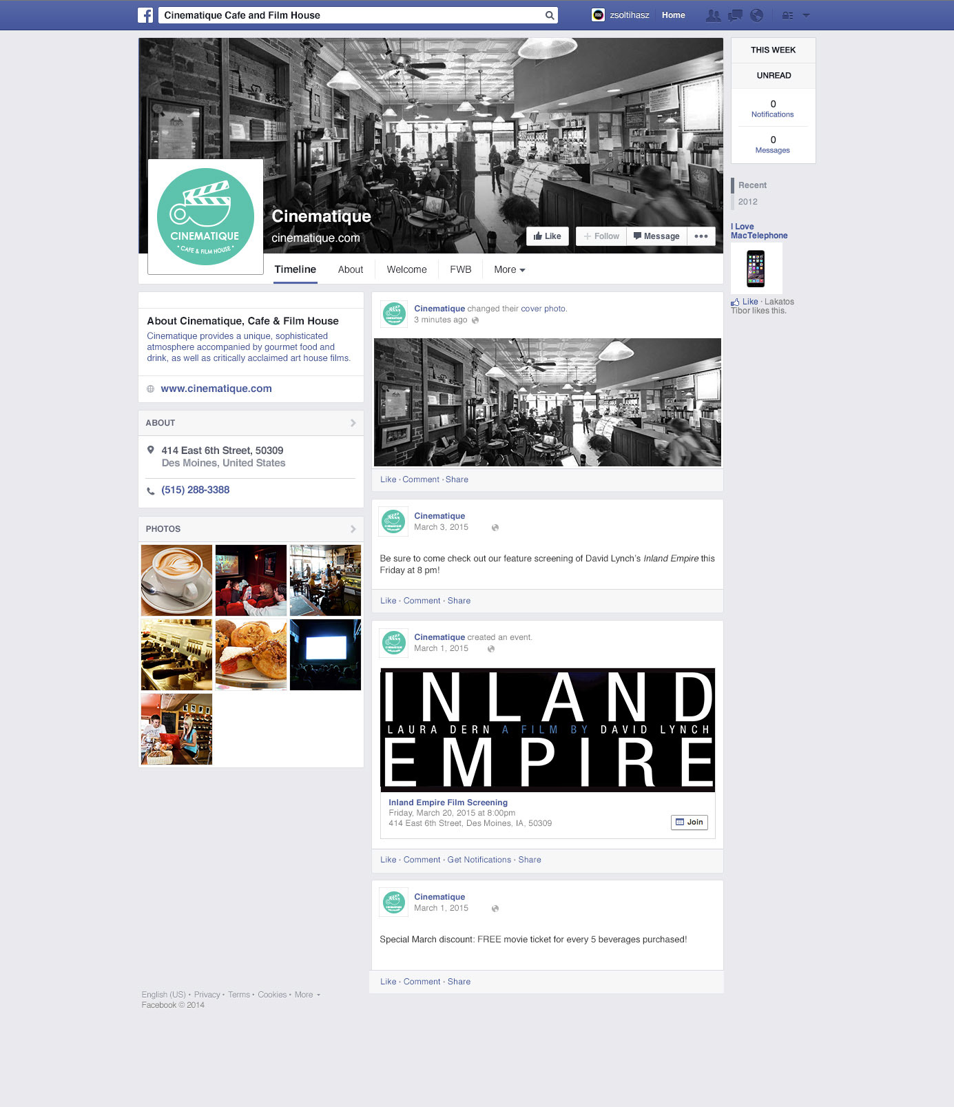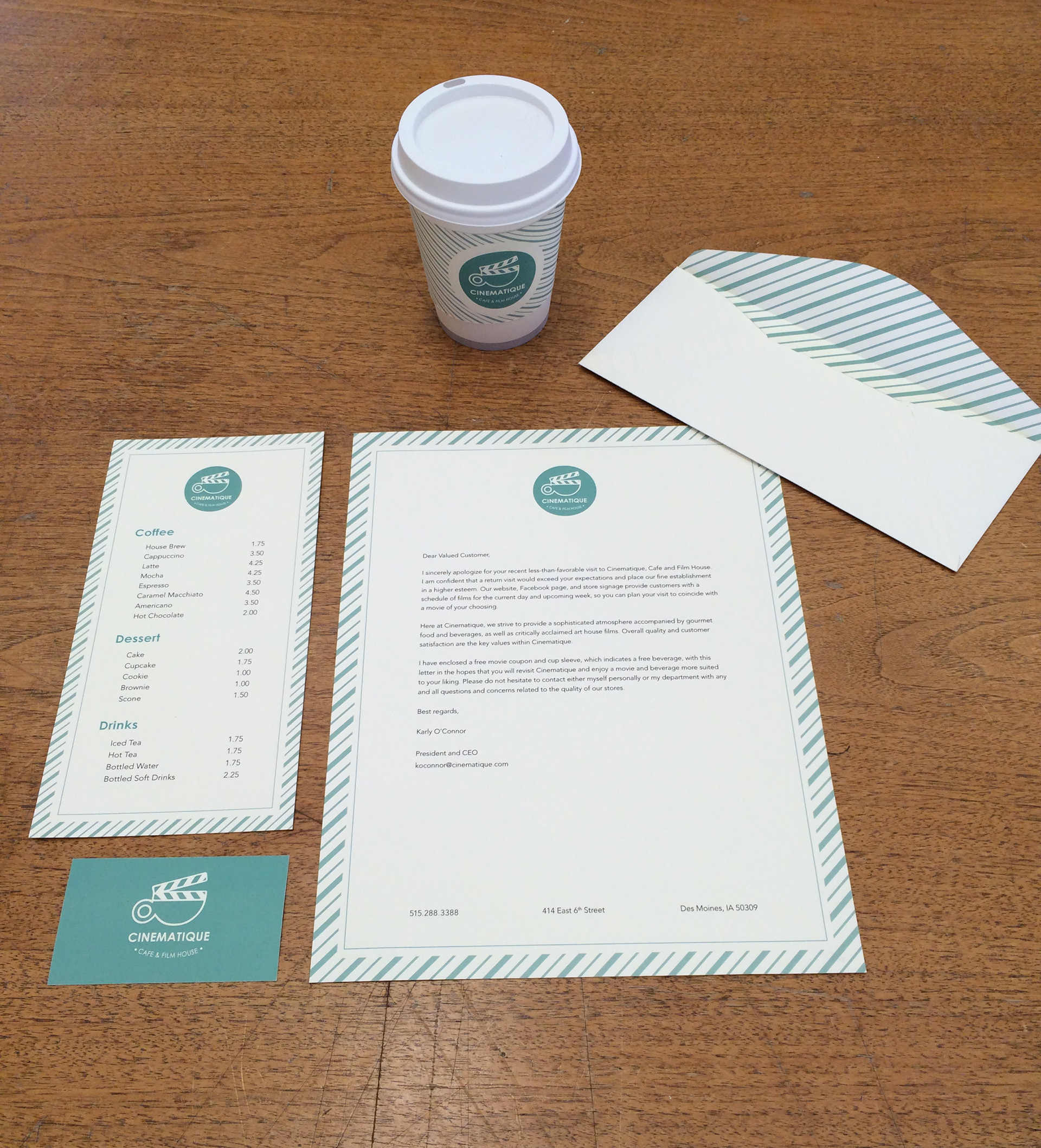 Branding project for the fictional company Cinematiqué, Cafe and Film House. Designed with InDesign CC. Project includes menu design, letterhead, envelope, cup sleeves, business cards, and social media themes.