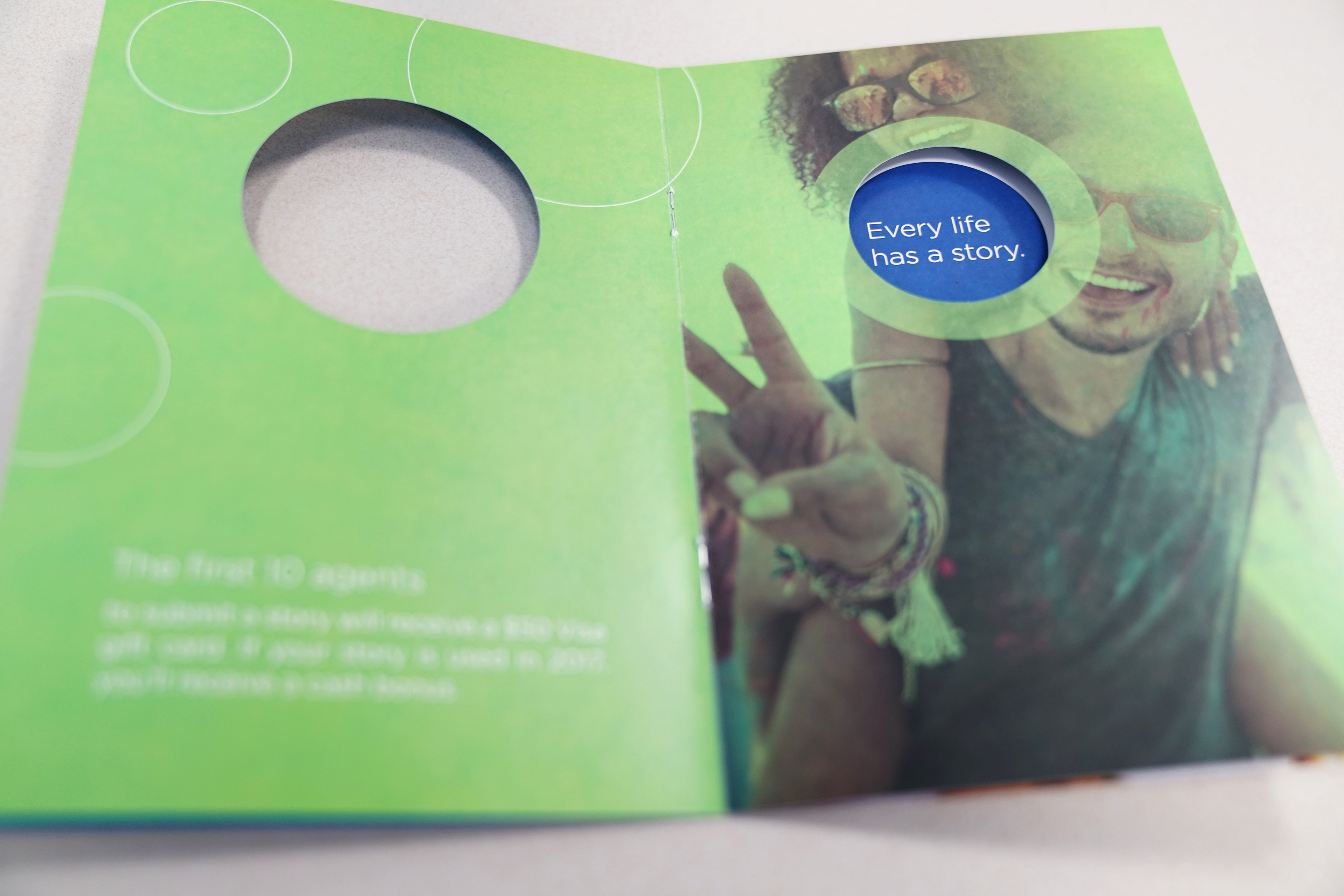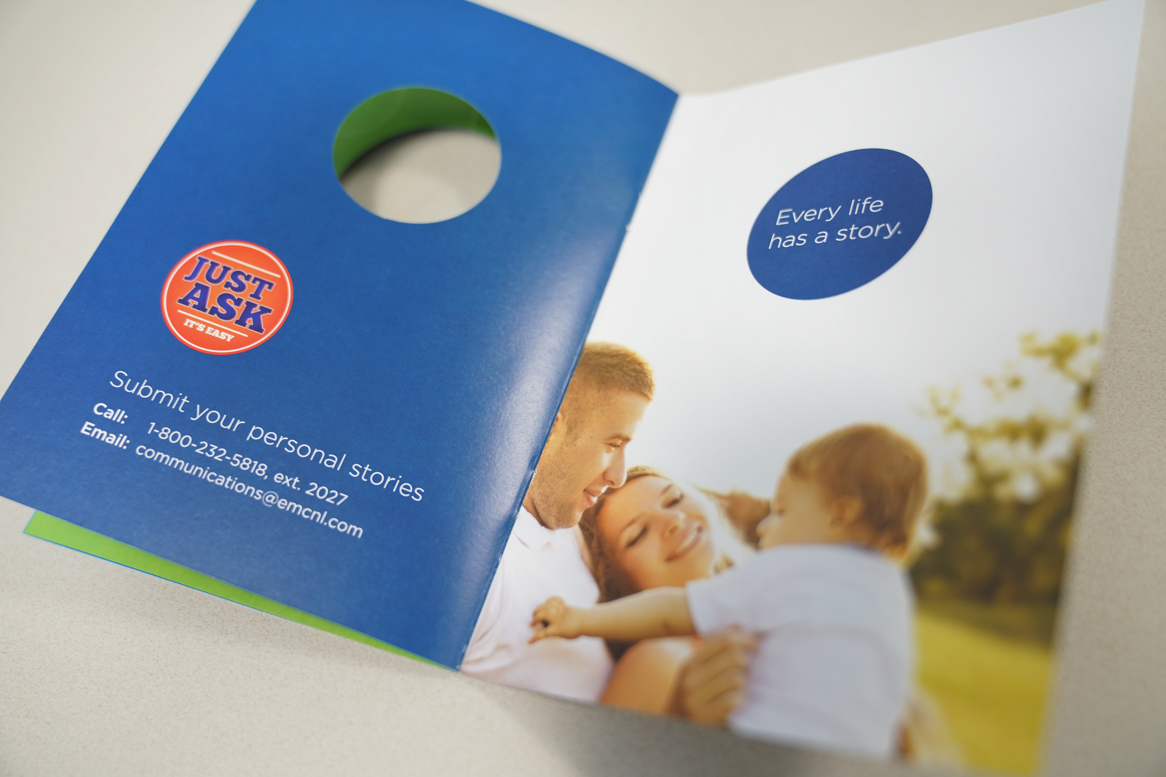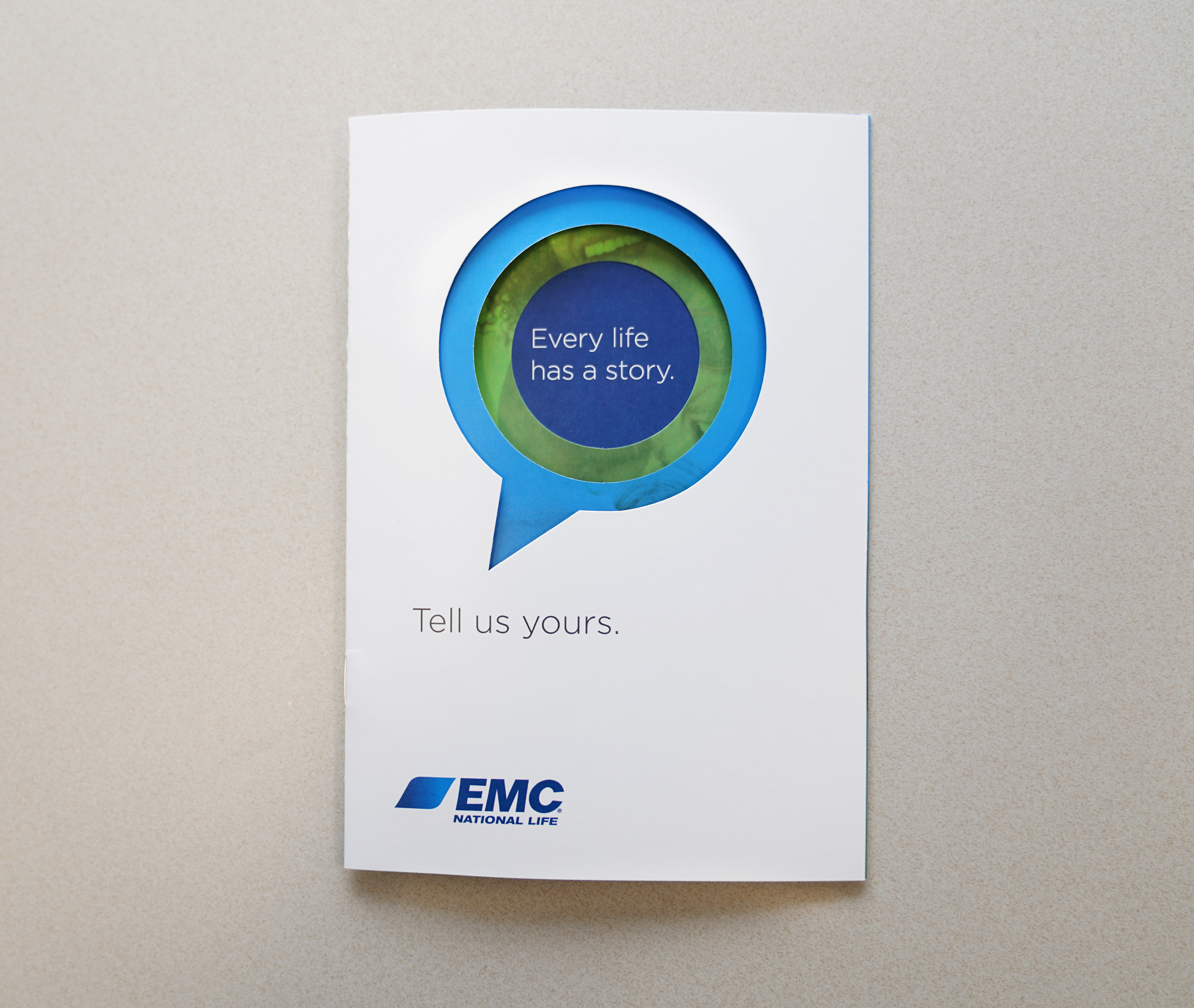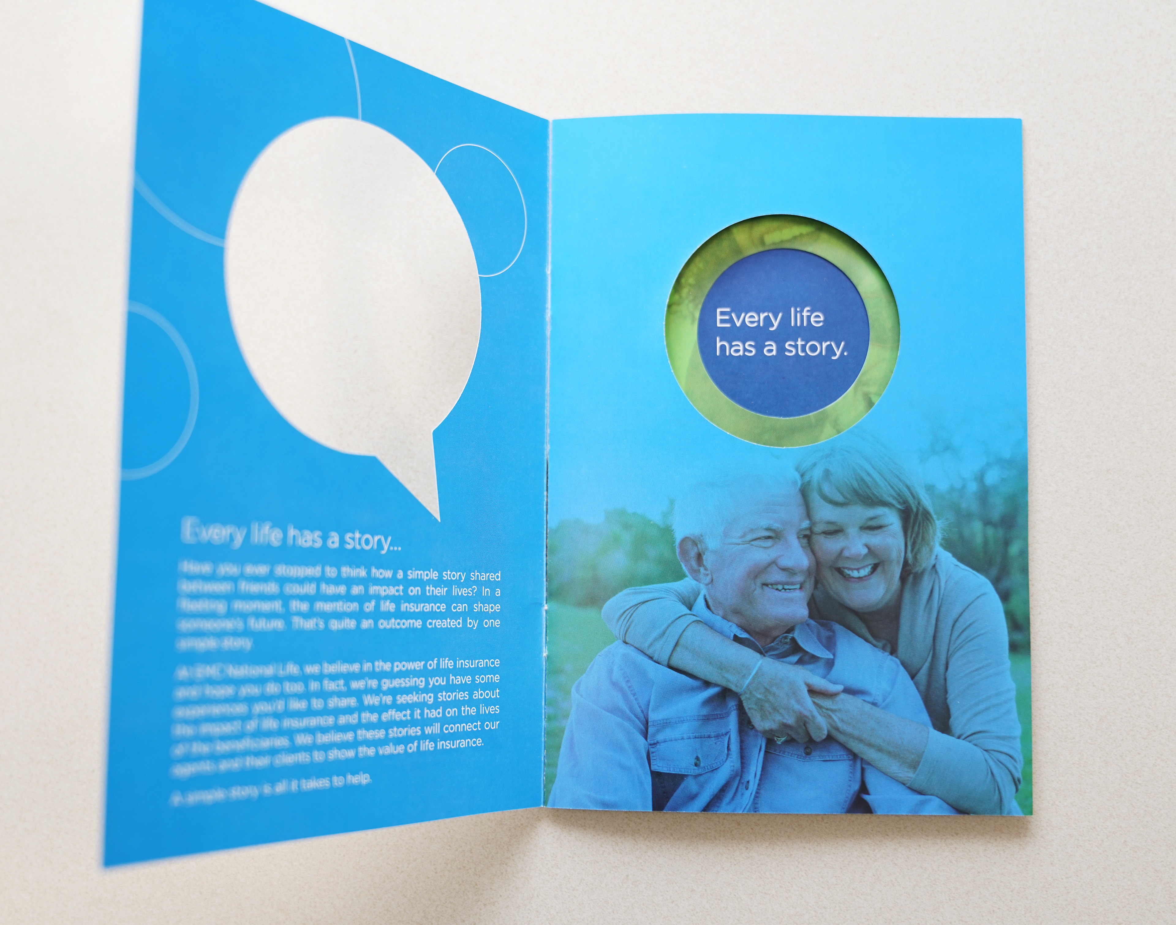 In 2017, EMC National Life launched the "Life Stories" campaign, wherein our marketing team gathered agents' stories about life insurance. We then shared these stories through a year-long webinar series in order to build awareness of the need for life insurance. I designed the introductory booklet featuring circular die-cuts throughout the piece. I also designed the email templates, helped develop the webinars, and designed all print materials for this campaign.