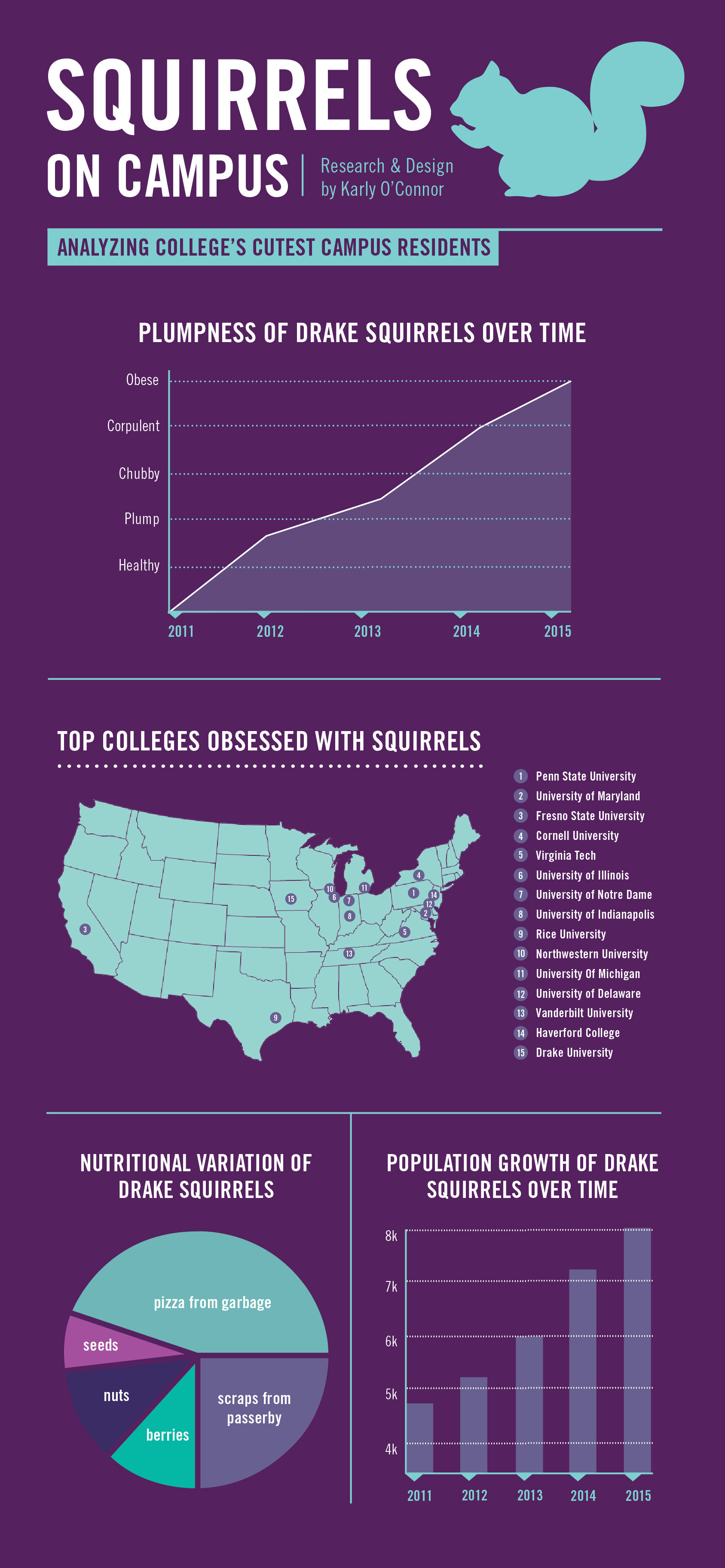 An infographic on the prevalence and importance of squirrels on college campuses. Designed with Illustrator CC.
